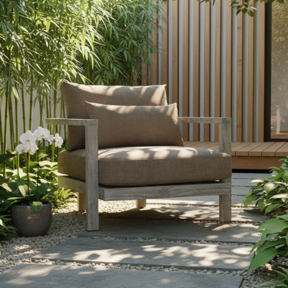 เก้าอี้พักผ่อนไม้สักกลางแจ้งทันสมัย สีธรรมชาติ สำหรับโรงแรม สวนสาธารณะ สนามหลังบ้าน ห้องรับประทานอาหาร และห้องนั่งเล่น