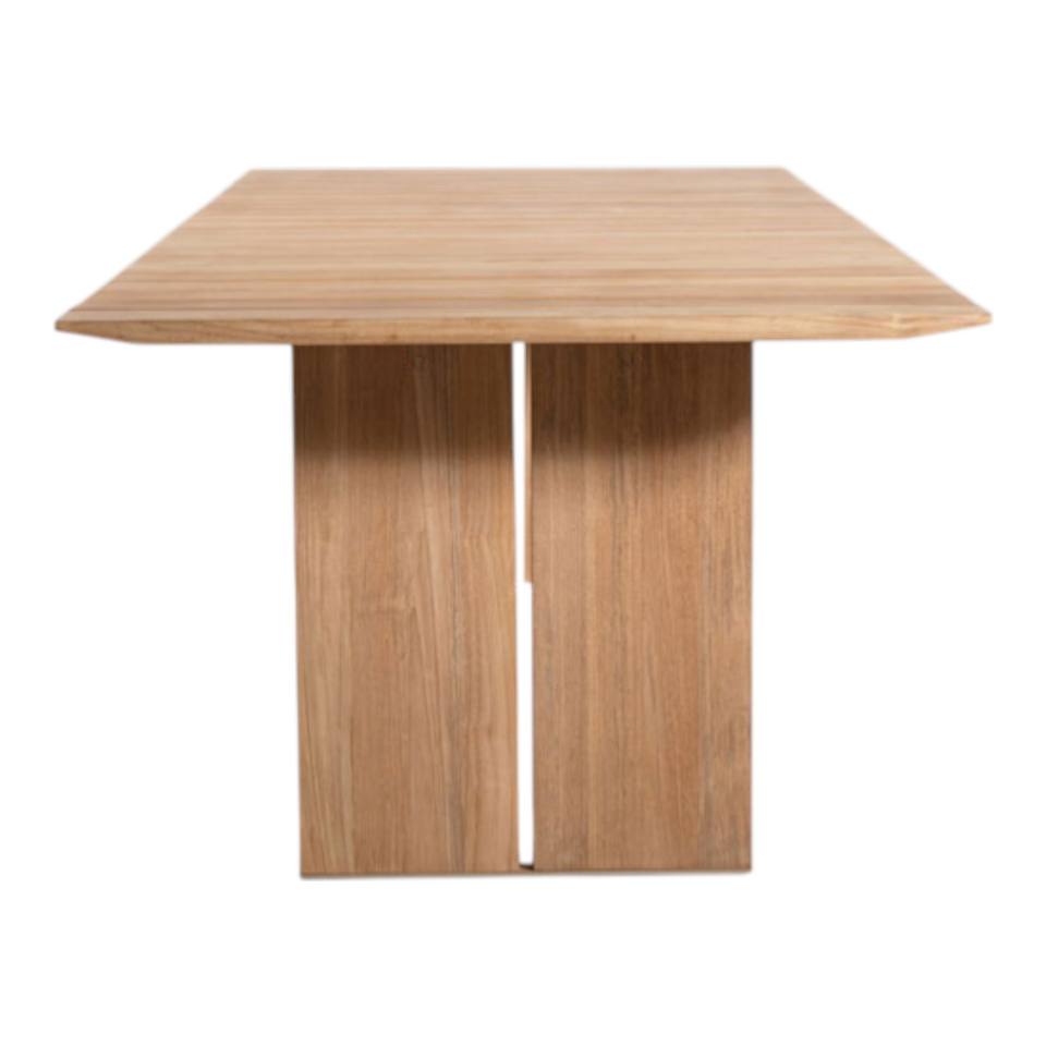 โต๊ะรับประทานอาหารไม้สักกลางแจ้งสไตล์โมเดิร์น รูปทรงสี่เหลี่ยมผืนผ้า ดีไซน์เรียบง่าย สำหรับสวนหรือลานบ้าน พร้อมท็อปแบบไม้ระแนงและขาแบบเสา สำหรับห้องรับประทานอาหาร