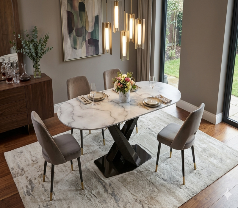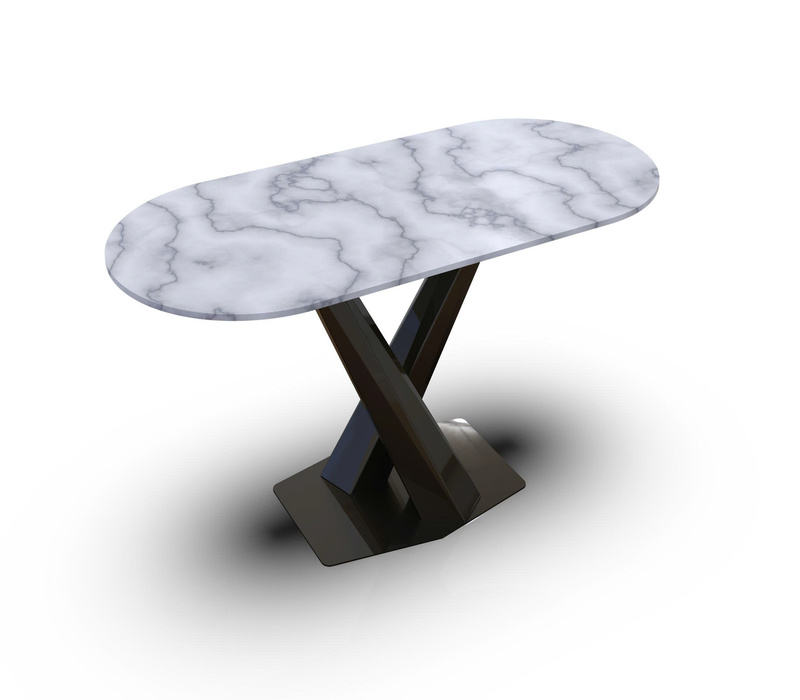 โต๊ะรับประทานอาหารหินอ่อนรูปวงรีทันสมัยพร้อมฐานรูปตัว X สแตนเลสสีดำสำหรับเฟอร์นิเจอร์ห้องรับประทานอาหารสุดหรู