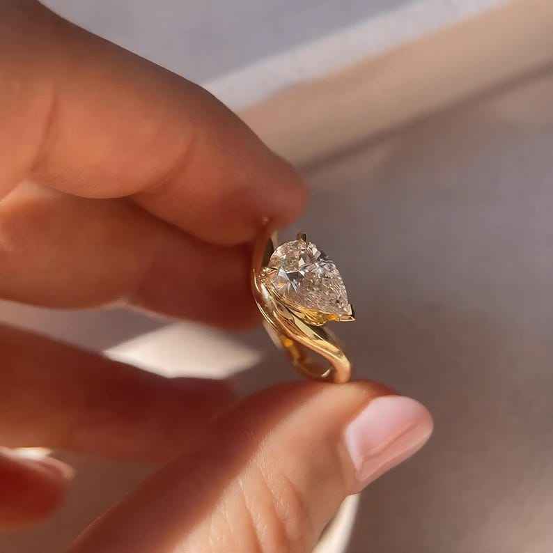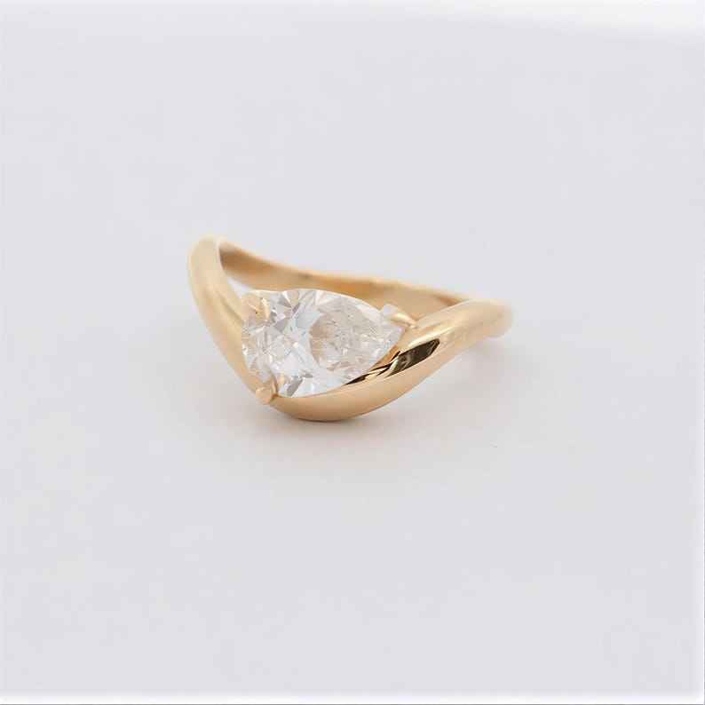 แหวนเพชรทรงลูกแพร์ทันสมัย แหวนวงโค้งประดับเพชรเม็ดเดี่ยว ทำด้วยมือ ทองคำ 14k สีเหลือง สำหรับผู้หญิง ของขวัญแต่งงานสำหรับเพื่อนเจ้าสาว