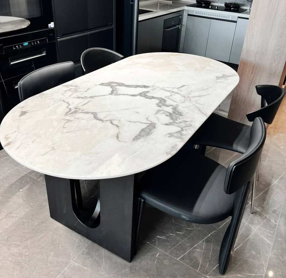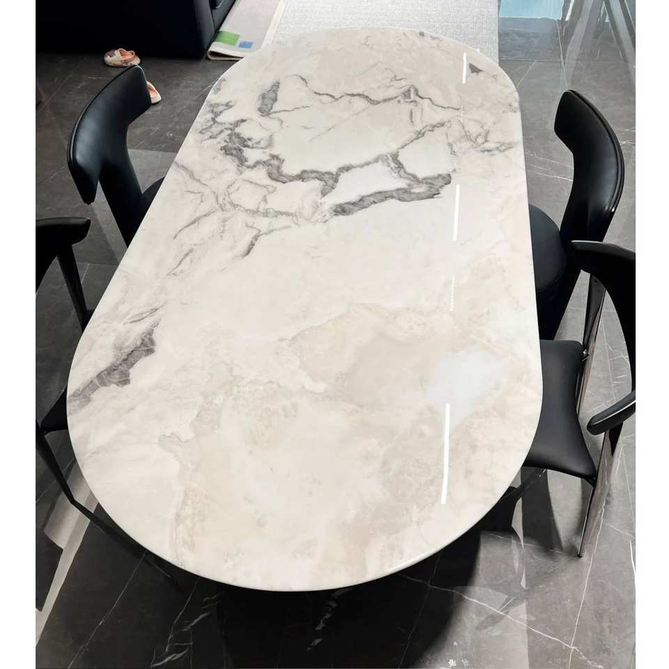 โต๊ะรับประทานอาหารศิลปะปิกัสโซ่แบบทันสมัยแผ่นหินควอทซ์ไซต์ธรรมชาติหรูหราวิลล่าหินอ่อนลายกราฟิกกันน้ำที่กำหนดเองได้