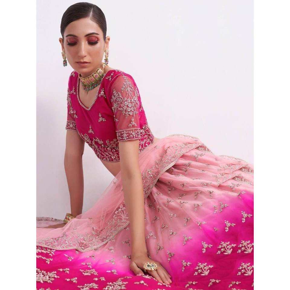 ชุดแต่งงานเลเฮนกาโชลีสีชมพูทันสมัย ผ้าตาข่ายปักลายหนา ยาวกรอมพื้น แขนสั้น ประดับพู่ห้อย