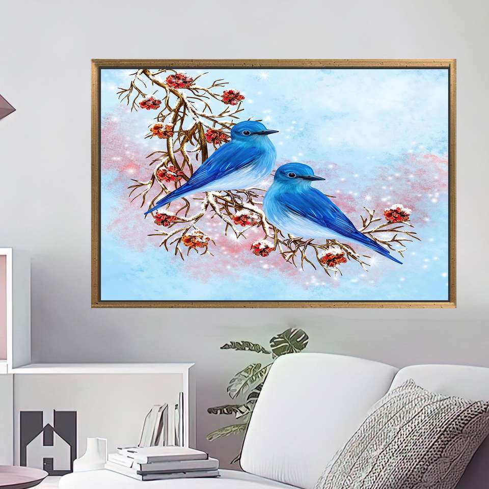 ภาพพิมพ์บนผ้าใบลายนกสองตัวสีน้ำเงินสไตล์โมเดิร์น - ของขวัญแฮนด์เมดแบบนามธรรม,1P:กรอบสีทอง