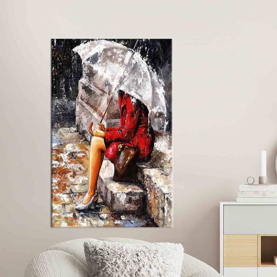 ภาพพิมพ์บนผ้าใบสมัยใหม่: ภาพนามธรรมของผู้หญิงกับร่มในสายฝน พร้อมกรอบสำหรับตั้งโชว์