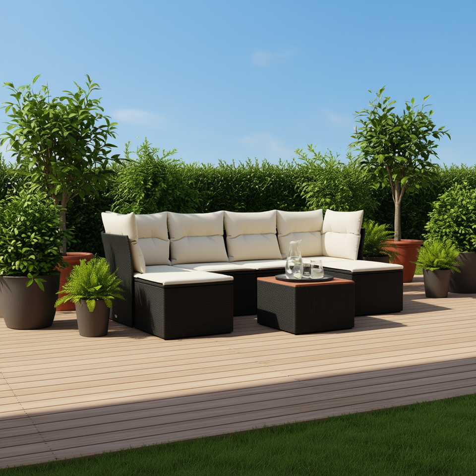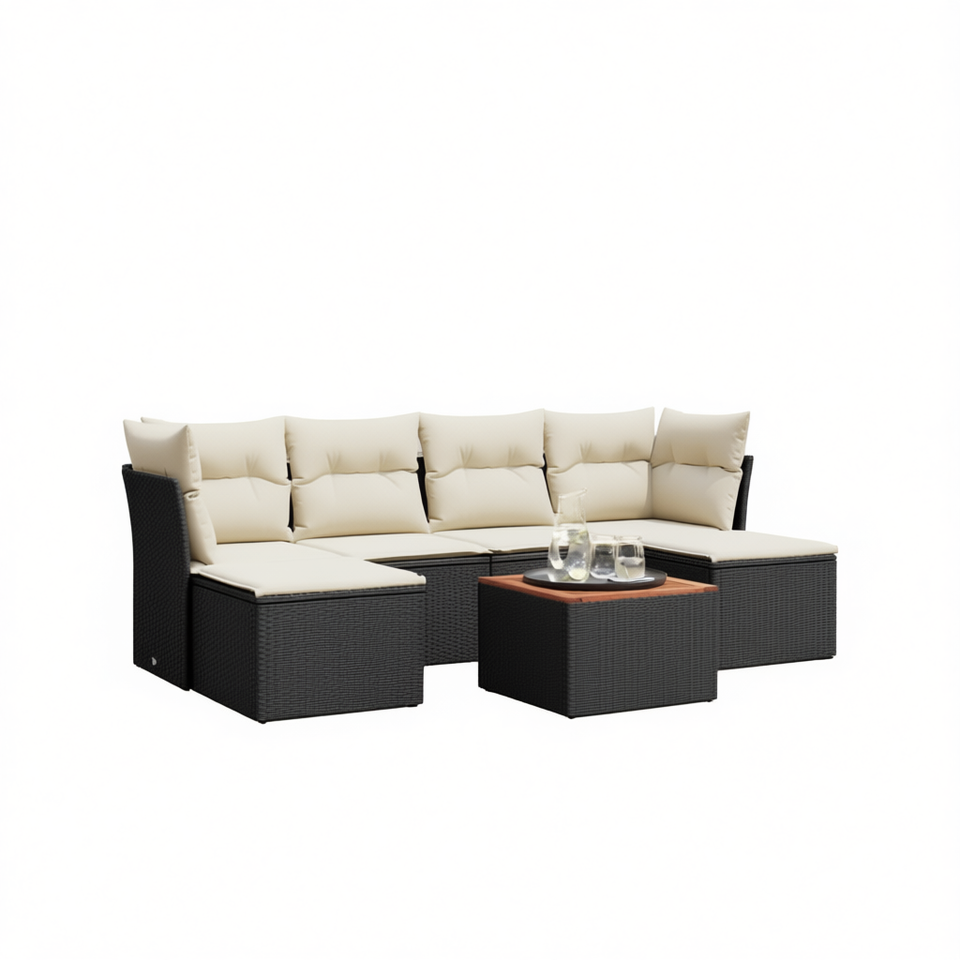 ชุดโซฟาหวายทันสมัยสำหรับลานบ้าน สีดำ พร้อมเบาะรองนั่ง เฟอร์นิเจอร์กลางแจ้ง สำหรับ 7 ที่นั่ง ดีไซน์ร่วมสมัย
