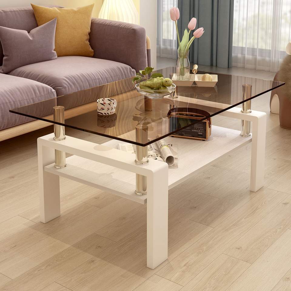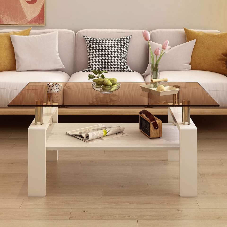 โต๊ะกาแฟทรงสี่เหลี่ยมทันสมัยพร้อมท็อปกระจกนิรภัยสีน้ำตาลและชั้นวาง MDF สำหรับห้องนั่งเล่น