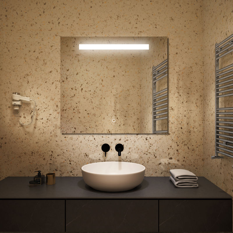 กระจกห้องน้ำสี่เหลี่ยมผืนผ้าไฟ LED สำหรับโรงแรมและร้านเสริมสวยทรงสี่เหลี่ยมผืนผ้าควบคุมด้วยระบบสัมผัส