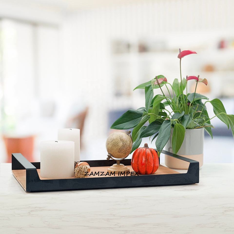 ถาดไม้อะคาเซียทรงสี่เหลี่ยมผืนผ้าทันสมัยถาดเสิร์ฟโลหะพร้อมที่จับวัสดุคู่สำหรับใส่ของว่างบนโต๊ะสำหรับเครื่องดื่ม