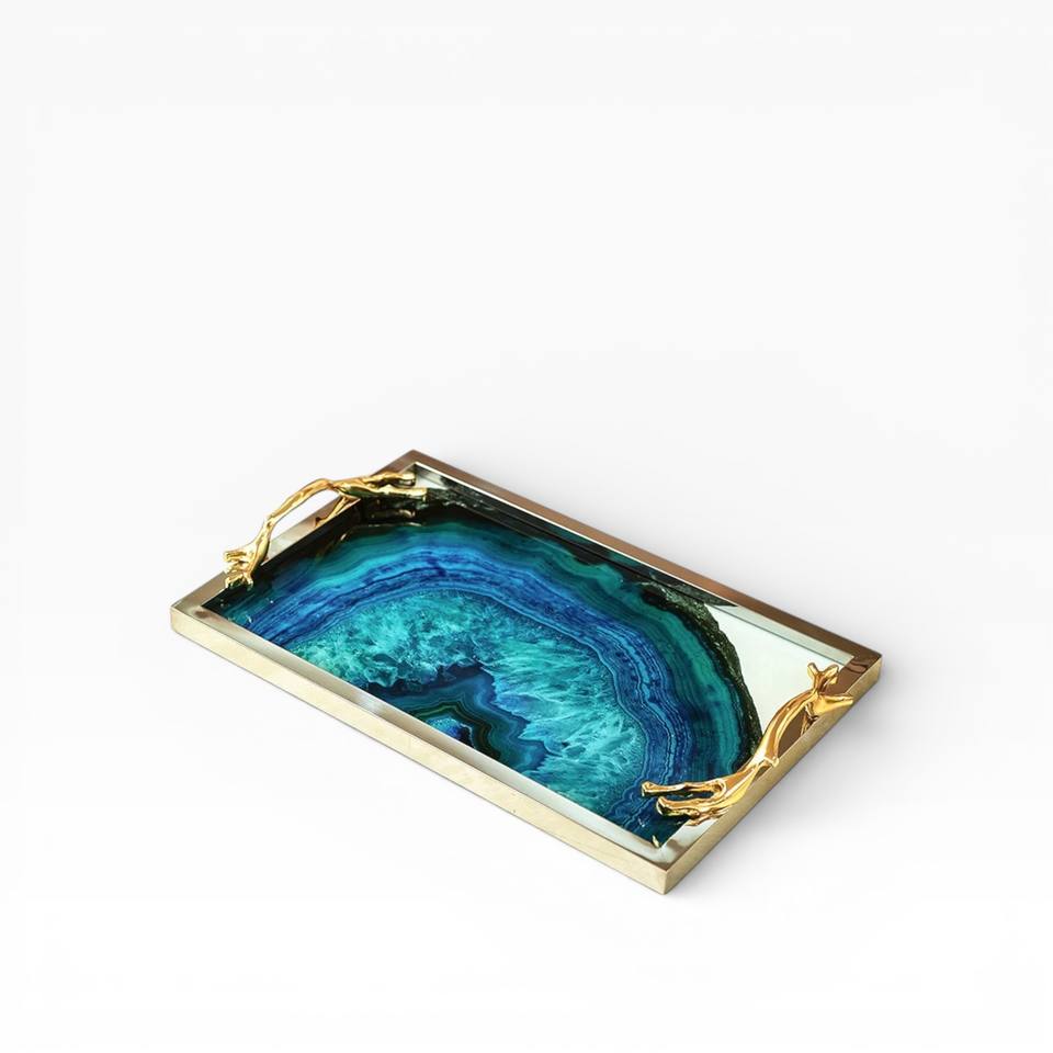 ถาดหินอาเกตสีน้ำเงินทรงสี่เหลี่ยมทันสมัย พร้อมช่องกลางคริสตัลลึก และหูจับกรอบสีทองเรียบหรู