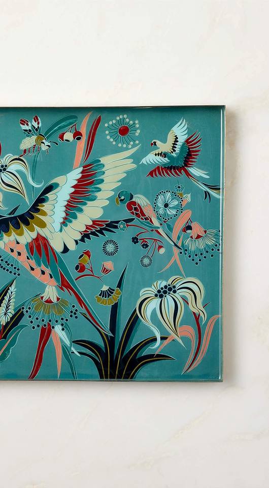 ถาดเสิร์ฟตกแต่งทรงสี่เหลี่ยมทันสมัย พร้อมเคลือบเงา ลายพิมพ์ดอกไม้และนกหลากสี ถาดโลหะสำหรับใช้ในบ้าน โรงแรม และเป็นของขวัญ