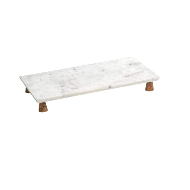 ถาดหินอ่อนสีขาวทรงสี่เหลี่ยมสไตล์อาร์ตเดโค ขาไม้ ถาดเสิร์ฟอเนกประสงค์ จานตกแต่งสำหรับห้องครัวและห้องรับประทานอาหาร