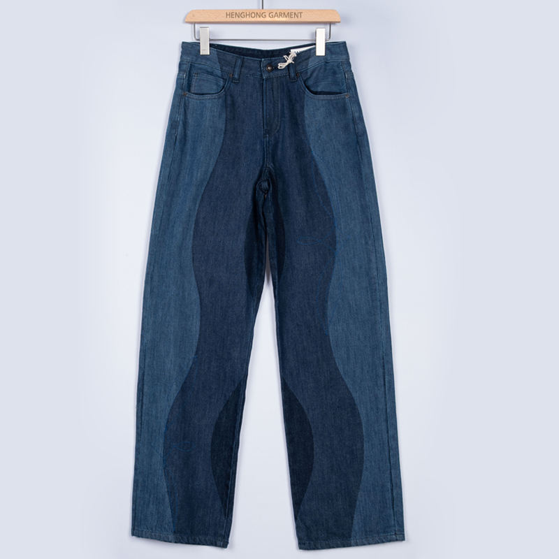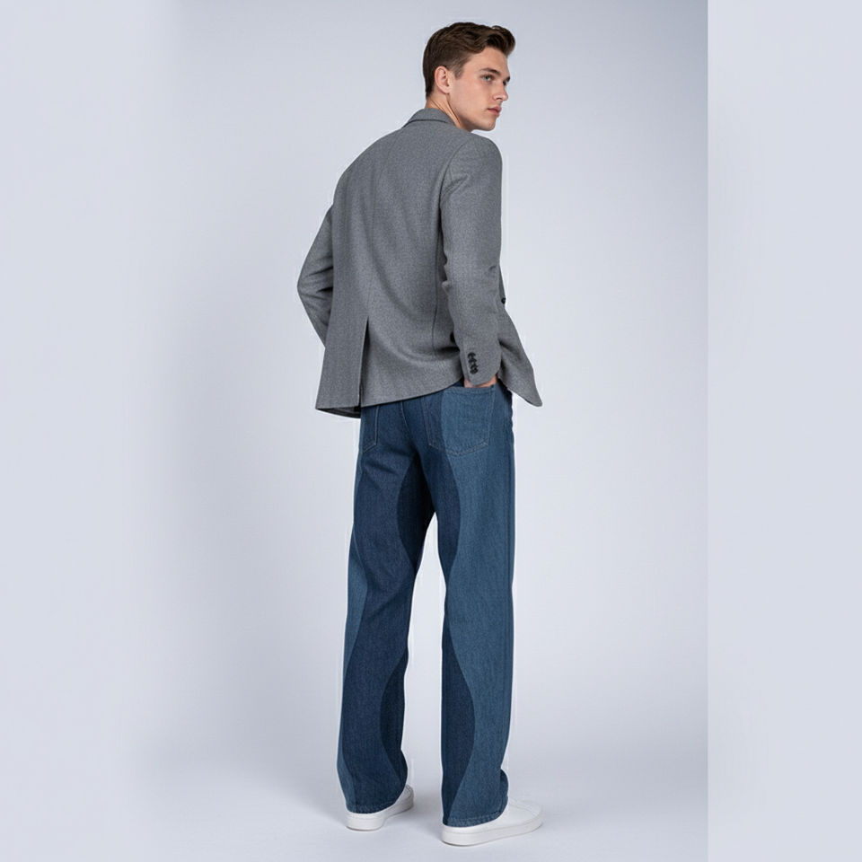 กางเกงยีนส์ผู้ชายสไตล์ลำลองทันสมัย ทรงขากว้าง ดีไซน์สบายๆ สีน้ำเงินเข้ม พร้อมลายเลเซอร์แบบคัลเลอร์บล็อก
