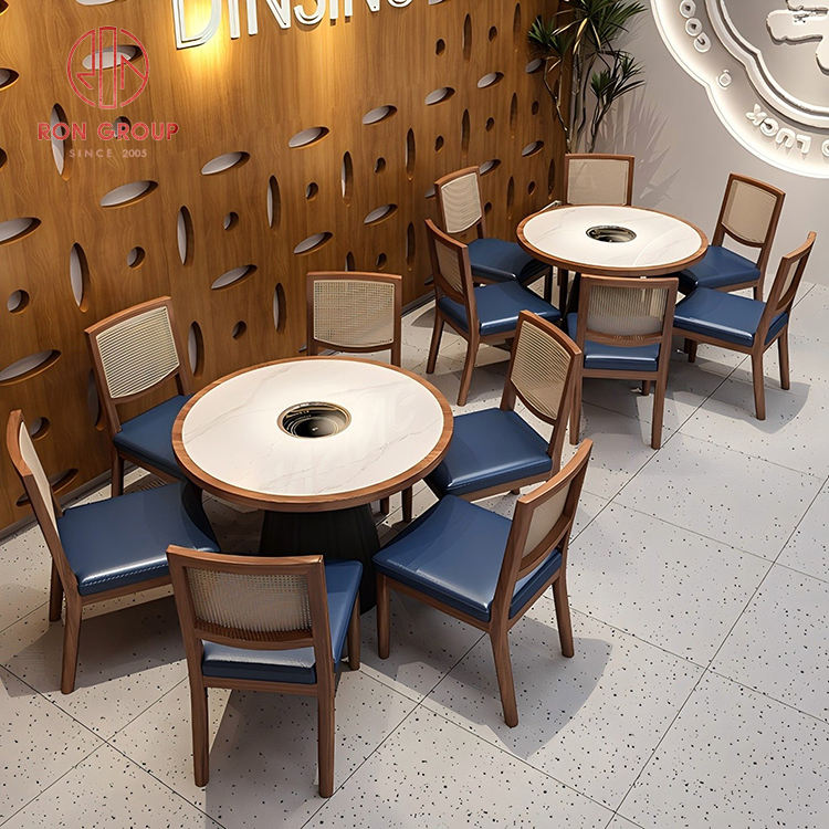 ชุดเฟอร์นิเจอร์ร้านอาหารทันสมัยโต๊ะหินอ่อนทรงสี่เหลี่ยมพร้อมช่องวงกลมกลางและเก้าอี้หวายสีฟ้า