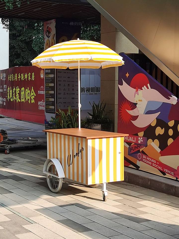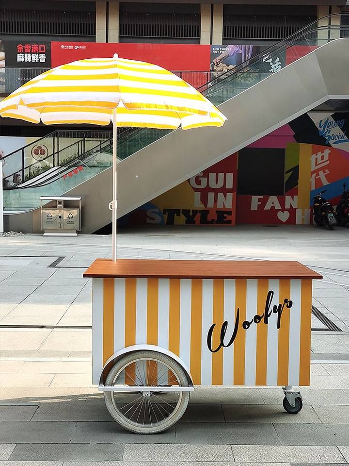 รถเข็นขายขนมหวานสไตล์เรโทรสีเหลืองแบบโมเดิร์น พร้อมชั้นวางสินค้าเหล็กสไตล์อเมริกันย้อนยุค