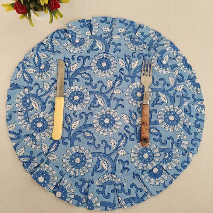 แผ่นรองจานแบบใช้แล้วทิ้ง ลายดอกไม้พิมพ์ลายด้วยมือ ผ้าฝ้าย 100% แบบกลับด้านได้ ปรับแต่งขนาดและสีได้ สีฟ้า สำหรับงานเลี้ยง บ้าน และครัว