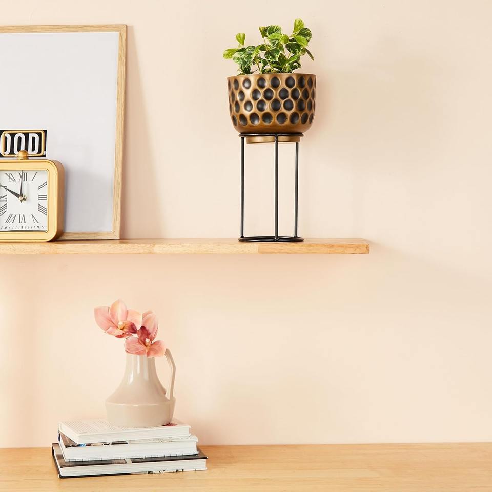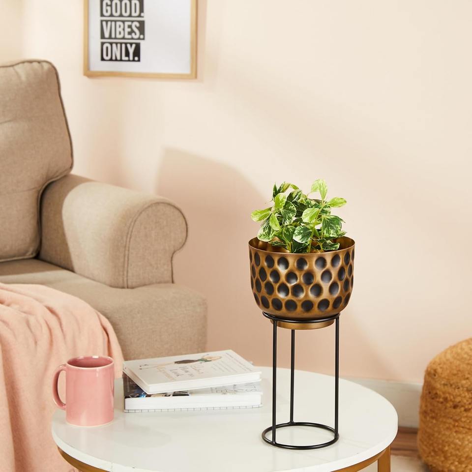 ที่ปลูกโต๊ะโลหะสีดำทรงกลมแบบโมเดิร์นพร้อมขาตั้งสำหรับในร่มสีเขียวตกแต่งบ้านมีสไตล์และจัดแสดงบนโต๊ะจากอินเดีย