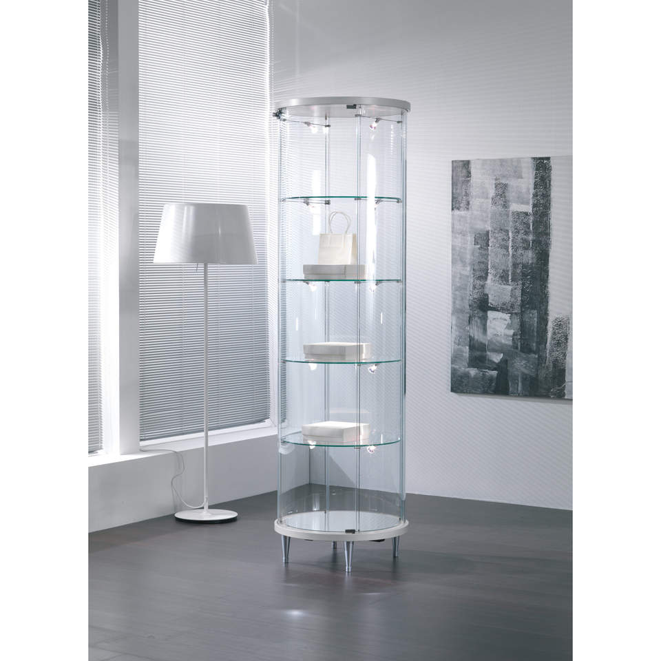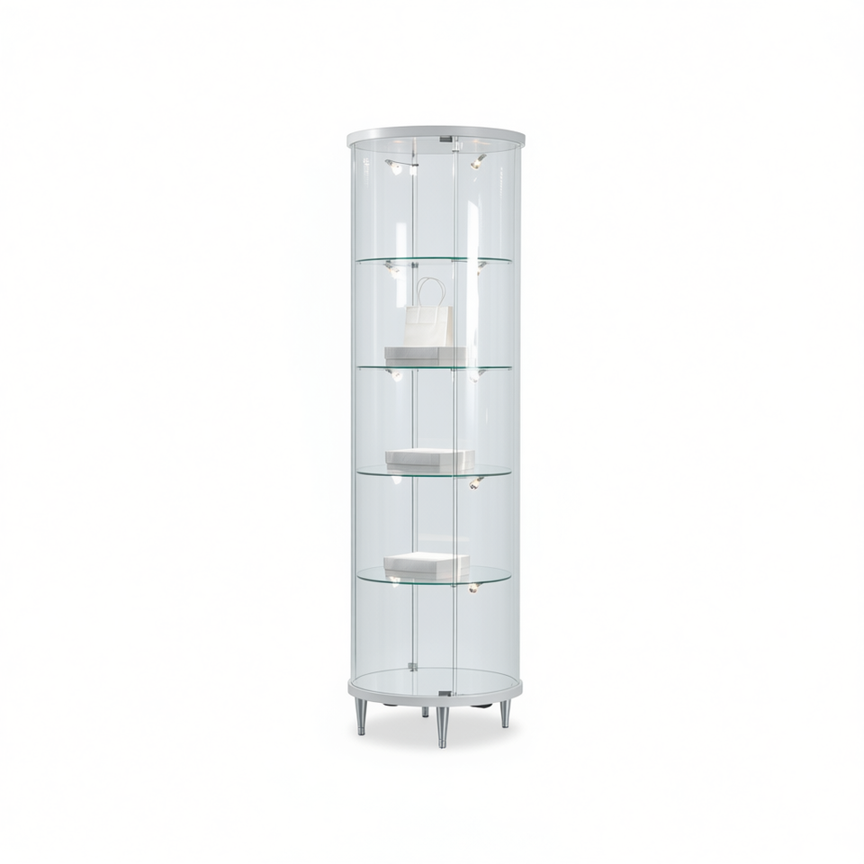 ตู้โชว์กระจกทรงกลมทันสมัย 70x190 ซม. สีขาวเงา ไฟ LED ชั้นวางปรับได้ ประตูบานพับ