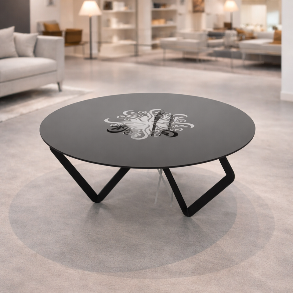 โต๊ะกาแฟทรงกลมโลหะทันสมัย ลายฉลุเลเซอร์ศิลปะ หน้าโต๊ะเคลือบสีดำ โครงเหล็กเคลือบสีฝุ่น ดีไซน์สวยงาม เฟอร์นิเจอร์ห้องนั่งเล่น