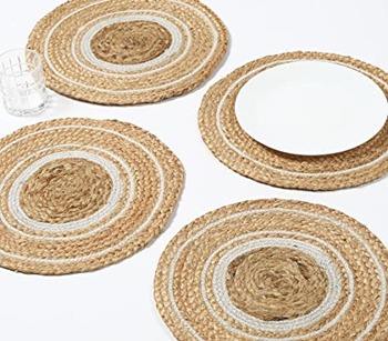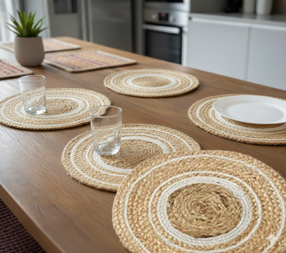 แผ่นรองจานทรงกลมลายดอกไม้ทันสมัย ผลิตจากวัสดุปอกระเจาและผ้าฝ้าย เป็นมิตรต่อสิ่งแวดล้อม เหมาะสำหรับใช้ในบ้าน