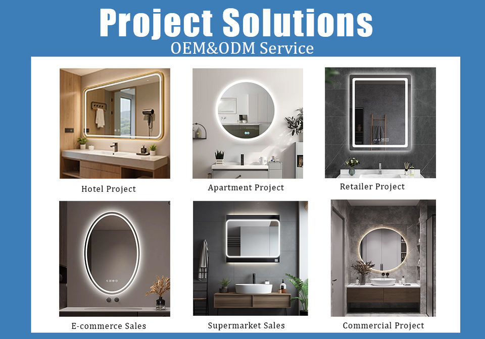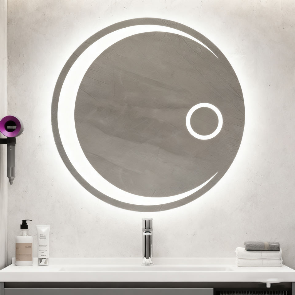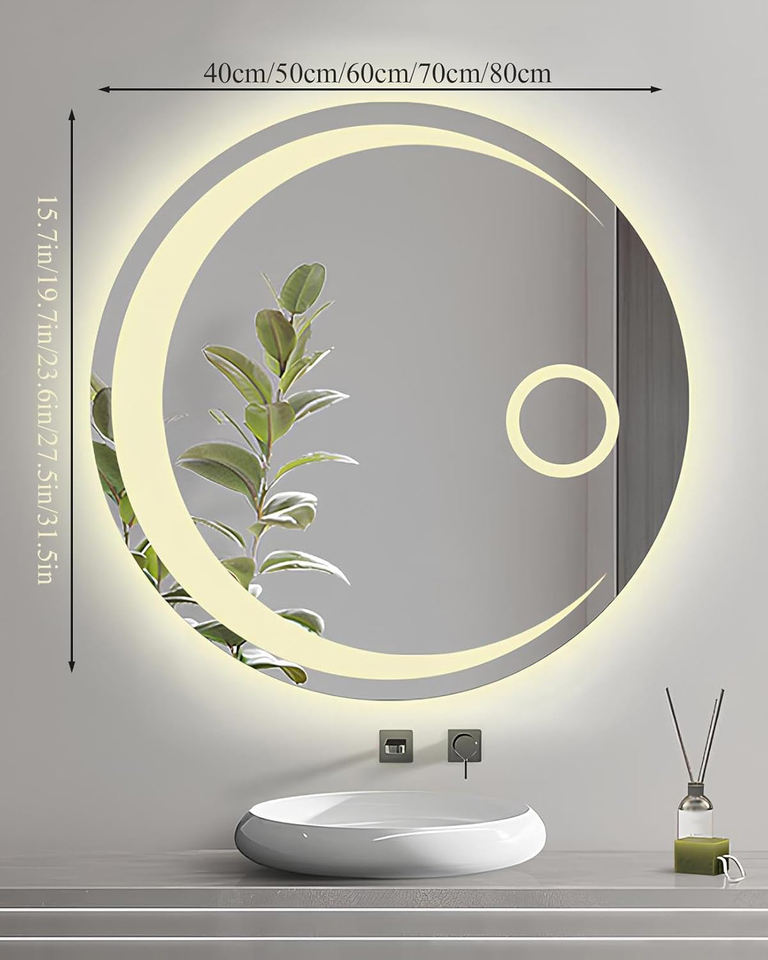 กระจกสะท้อนแสงติดผนังทรงกลมแบบ LED สำหรับห้องน้ำกระจกมีไฟด้านหลังแบบสัมผัสหน้าจอดีไซน์อาร์ตเดคโคอัจฉริยะทันสมัย