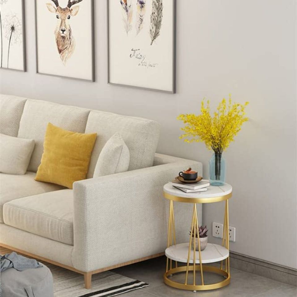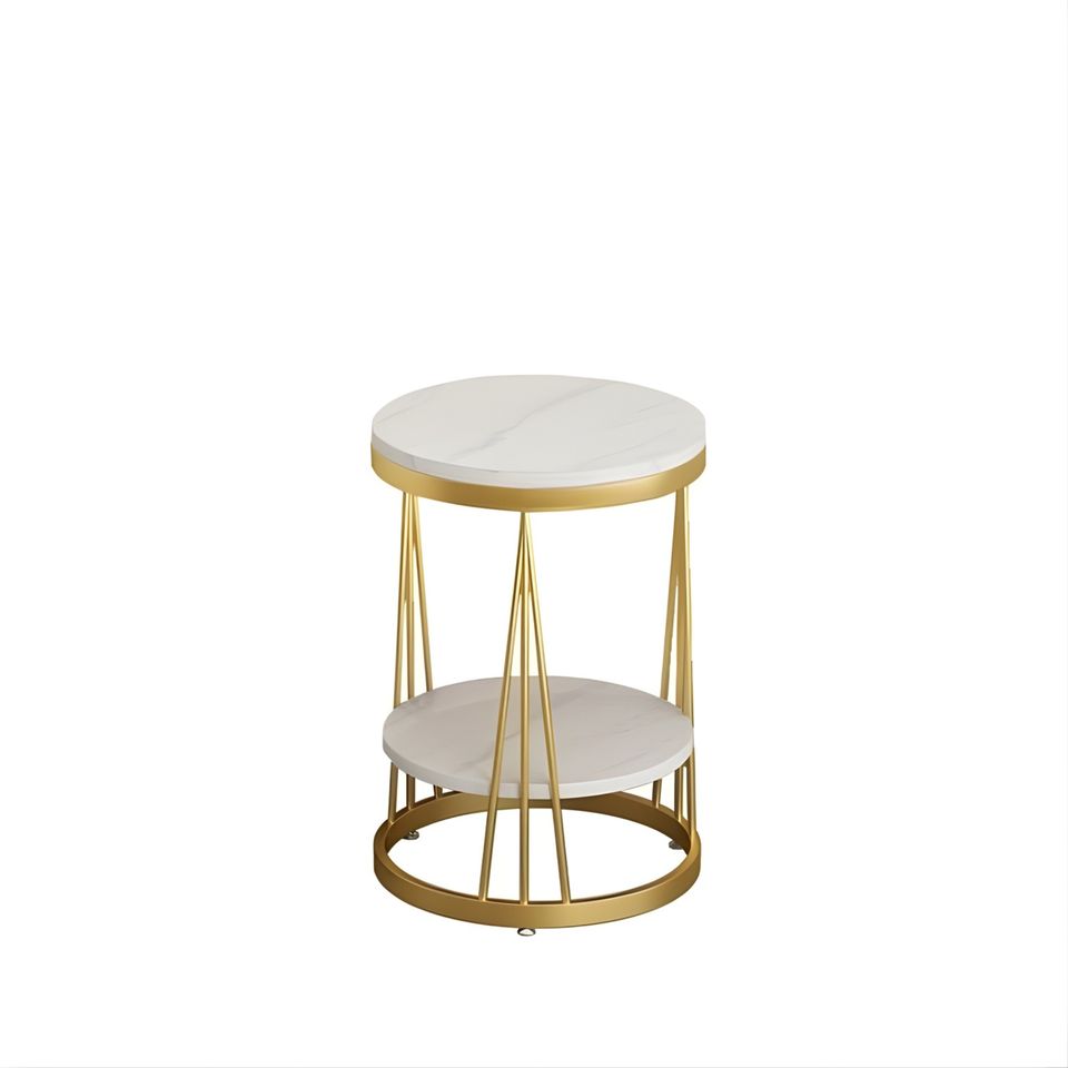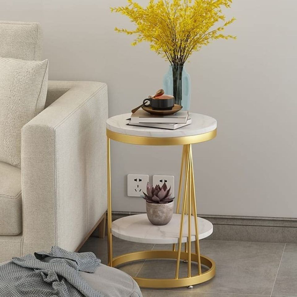 โต๊ะกาแฟทรงกลมสีขาวไม้สไตล์โมเดิร์น โต๊ะมุมห้องนอนข้างเตียง ขาเหล็กเคลือบสีทอง เฟอร์นิเจอร์โต๊ะ
