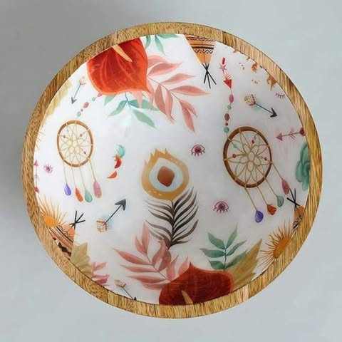 ชามไม้พิมพ์ลายเคลือบแบบชนบทชามไม้ทรงกลมสำหรับเสิร์ฟสลัดเคลือบด้วยกระดาษสำหรับงานปาร์ตี้ชามเคลือบไม้