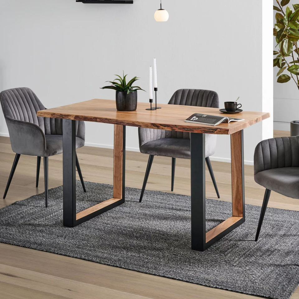 โต๊ะอาหารพับได้สองสี โทนสีธรรมชาติ หน้าโต๊ะไม้เนื้อแข็งอะคาเซียสไตล์โมเดิร์นรัสติก พร้อมฐานไม้สีดำขอบธรรมชาติ เป็นมิตรกับสิ่งแวดล้อม