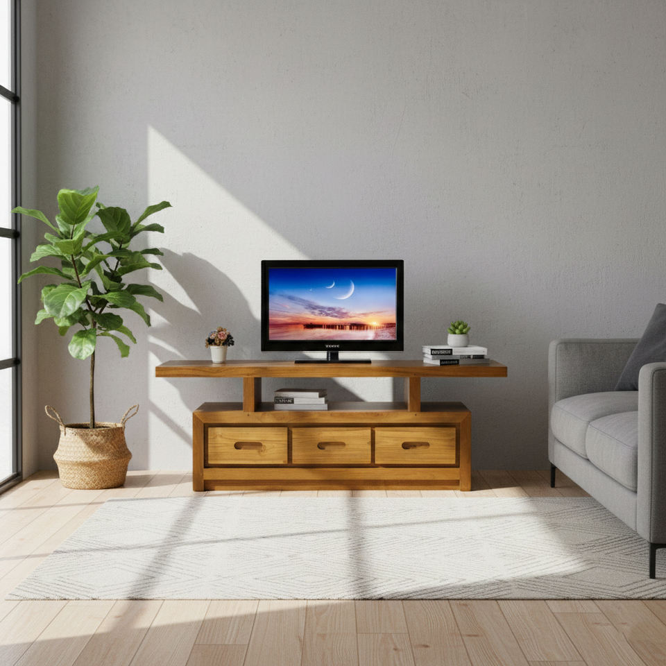 ตู้วางทีวีไม้สักสไตล์โมเดิร์นรัสติก 3 ลิ้นชัก ไม้ขัดผิวแบบธรรมชาติ ทนทาน ใช้งานได้ยาวนาน เฟอร์นิเจอร์ห้องนั่งเล่นสำหรับใช้ในบ้าน พร้อมฟังก์ชั่นจัดเก็บ