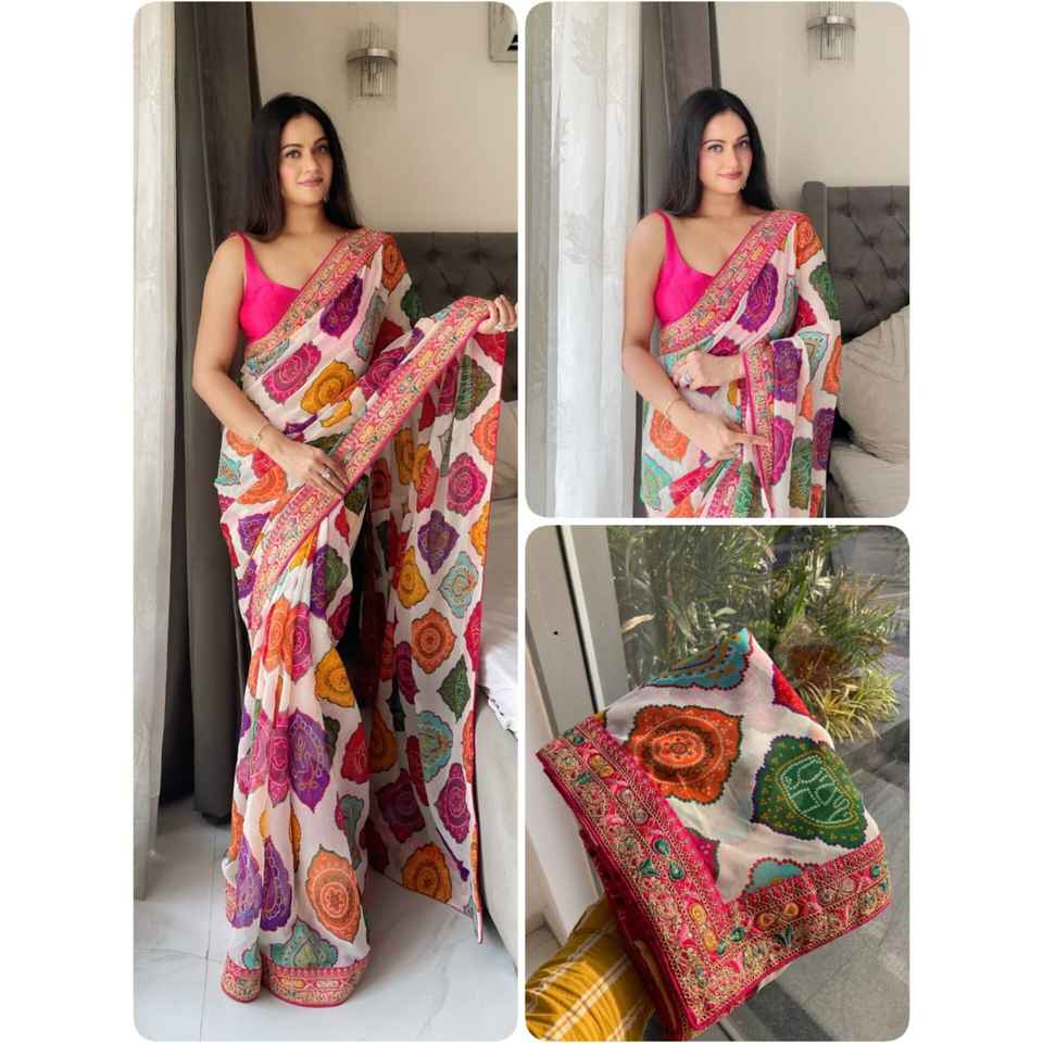 ผ้าซารีสมัยใหม่สำหรับงานแต่งงานและงานเลี้ยง ผ้าจอร์เจต์เนื้อนุ่มพรีเมียม พร้อมลายพิมพ์บันดาฮีและขอบลูกไม้ปักลายหลากหลาย