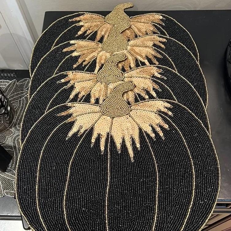 ที่รองจานประดับลูกปัดฟักทองผ้าซาตินดีไซน์ทันสมัยทำด้วยมือสำหรับงานปาร์ตี้ฮาโลวีนงานแต่งงานบ้านวันหยุดสวน
