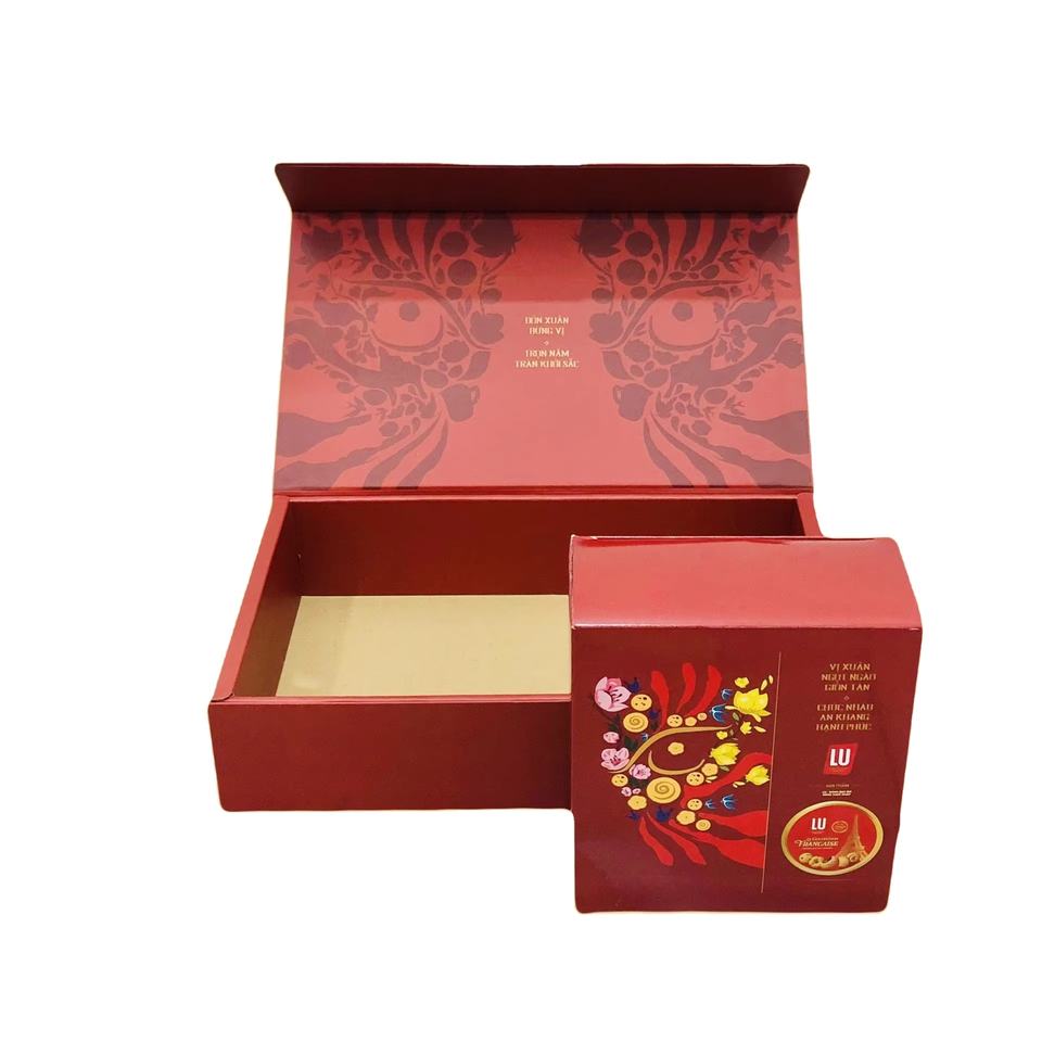 กล่องกระดาษแข็งเคลือบเงาสำหรับบรรจุอาหาร/ขนม ผลิตจากวัสดุรีไซเคิลแบบประกอบเองได้ พร้อมฝาปิดแม่เหล็กเคลือบ UV