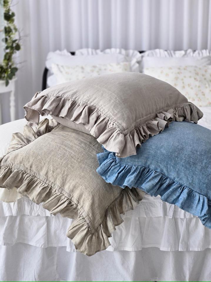 หมอนผ้าลินินโทรมแบบทันสมัยมีระบายสองชั้นขนาดควีนไซส์สามารถปรับแต่งโลโก้ได้กระดุมปิดทำมือโรงแรมออร์แกนิค