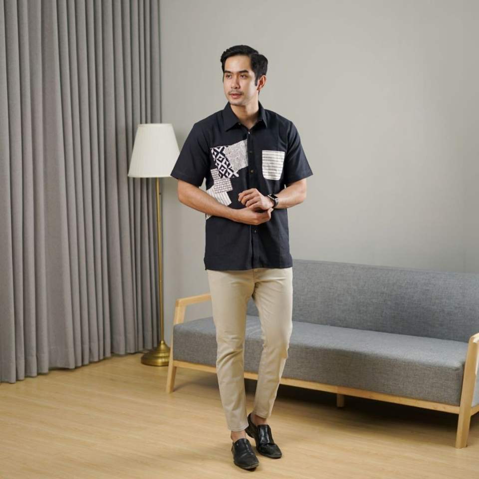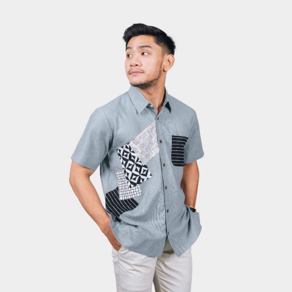 เสื้อเชิ้ตแขนสั้นติดกระดุมแบบทันสมัยผ้าบาติกสไตล์อินโดนีเซียแบบดั้งเดิมเนื้อผ้าสีฟ้าอ่อนแบบพรีเมียม