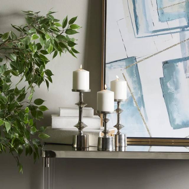 ชุดเชิงเทียนอลูมิเนียมสีเงินที่ทันสมัยตกแต่งบ้านโคมไฟเชิงเทียนเสาสำหรับโต๊ะอาหารและห้องนั่งเล่นสำหรับตกแต่งบ้าน