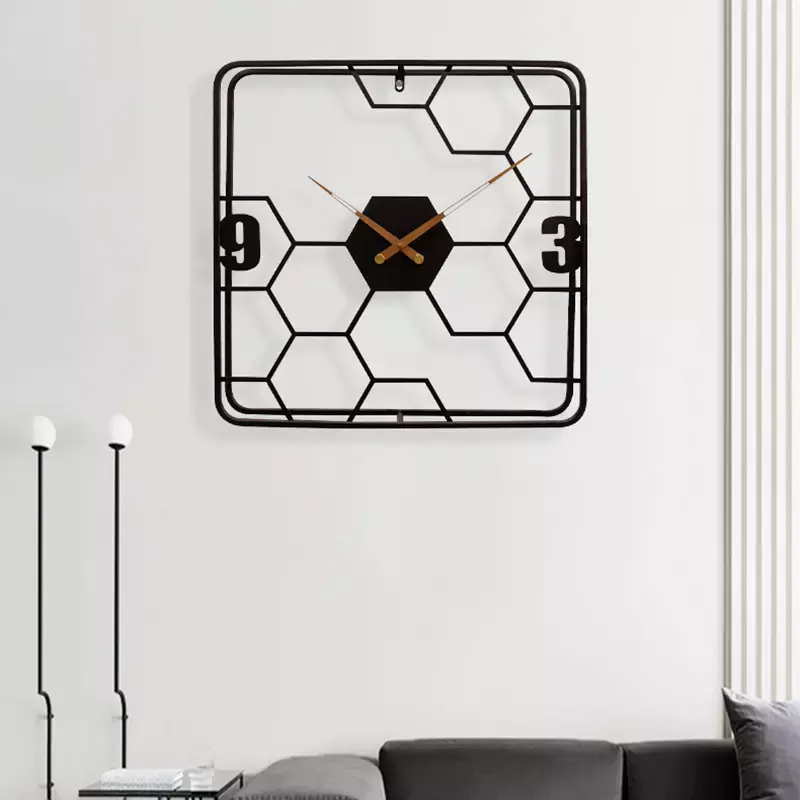 นาฬิกาแขวนผนังเหล็กสีดำรูปทรงสี่เหลี่ยมดีไซน์เรียบง่ายทันสมัยเข็มควอทซ์โลหะอินเดียสำหรับห้องนั่งเล่นตกแต่งห้องโถง