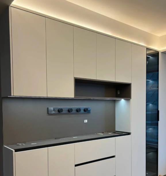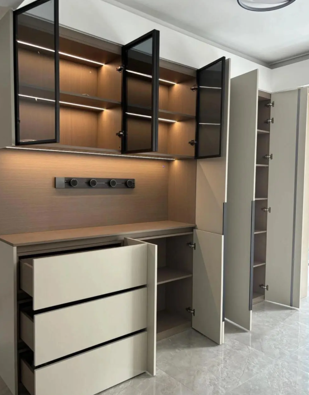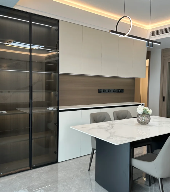 ตู้เก็บไวน์ทำจากไม้เนื้อแข็งเรียบง่ายทันสมัยหรูหราตู้เก็บไวน์แบบบูรณาการสำหรับห้องรับประทานอาหารที่บ้านสำหรับห้องนั่งเล่น