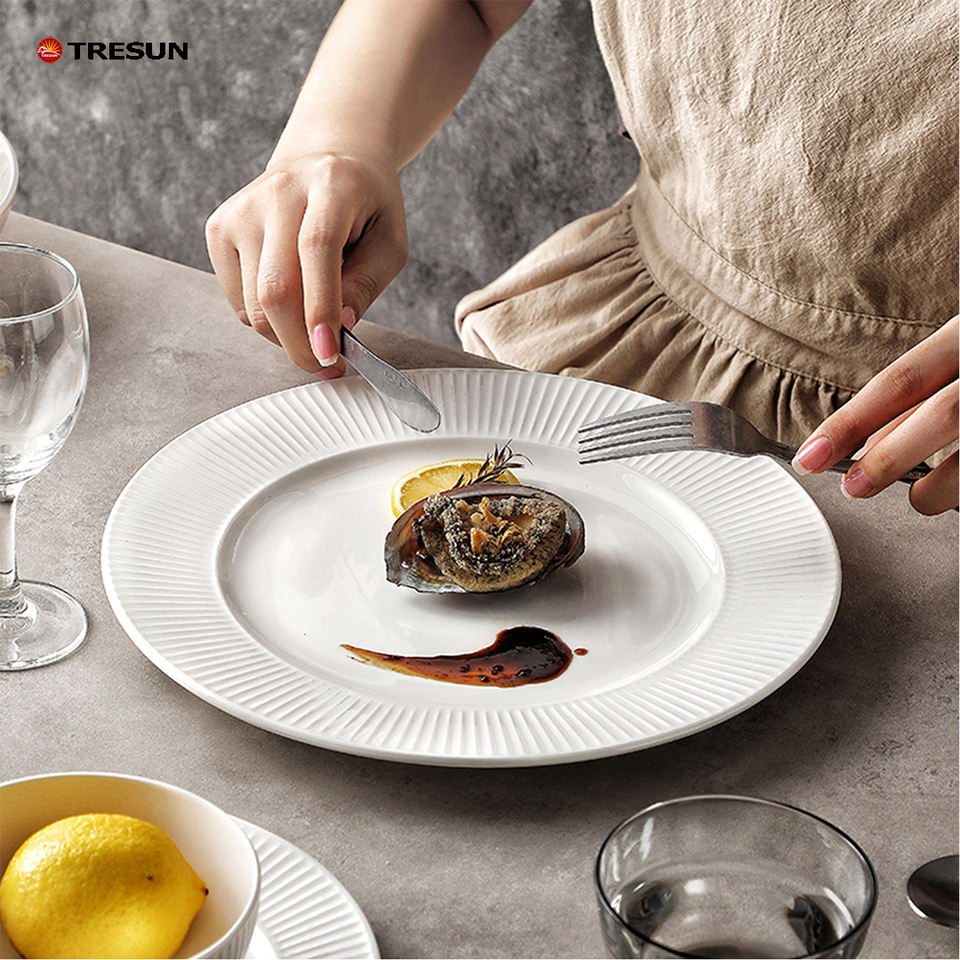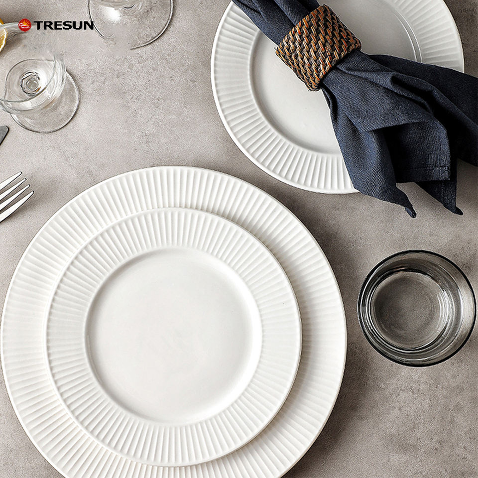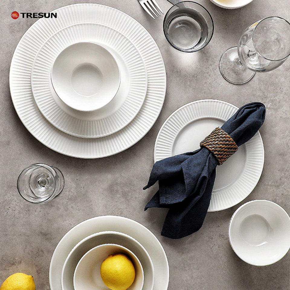 ชุดจานชามเซรามิกสีขาวเรียบง่ายทันสมัยสำหรับใช้ในบ้านหรือโรงแรม สำหรับซุป ของหวาน สลัด ข้าว