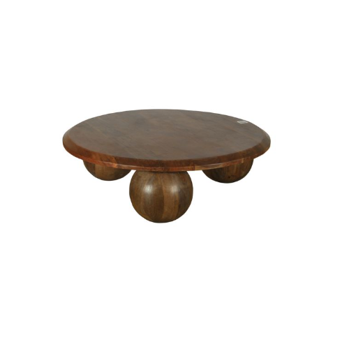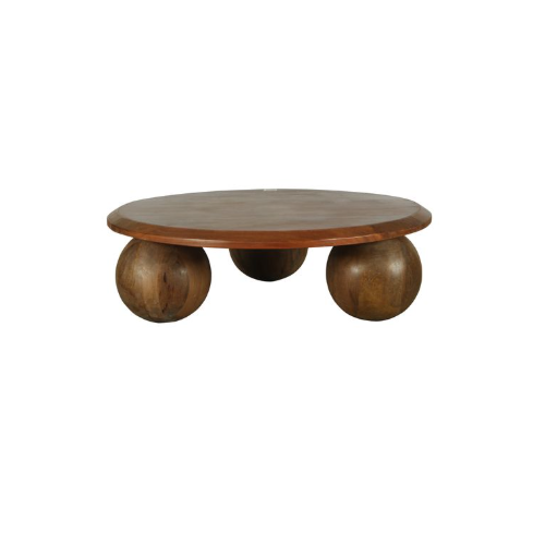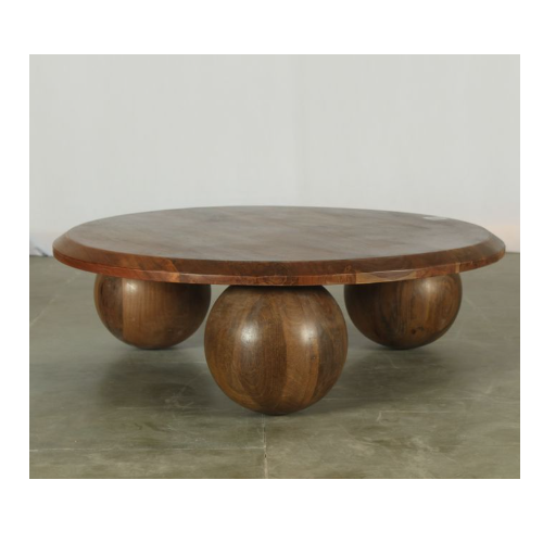 Modern Solid Mango Wood Round Coffee Table with Brown Finish Wooden Ball Shape Legs