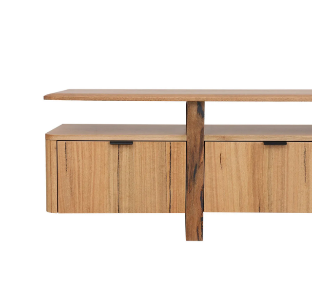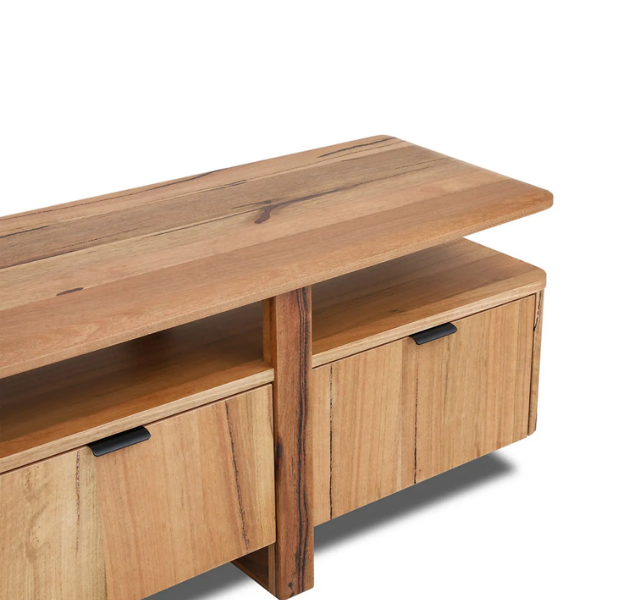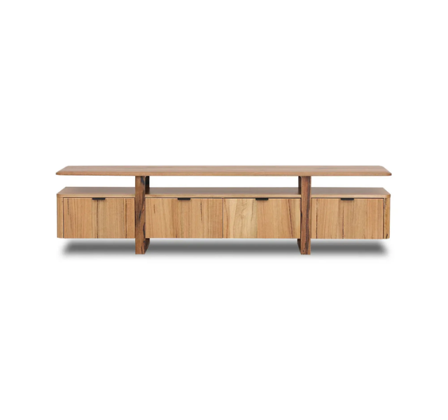 ตู้วางทีวีไม้สักแท้ทรงยาวทันสมัย พร้อมชั้นวางของด้านบน ตู้เก็บของแบบมินิมอลสำหรับห้องนั่งเล่น