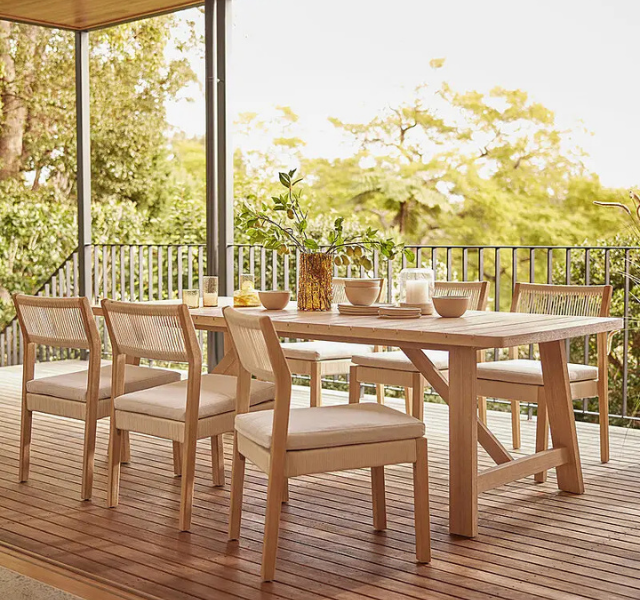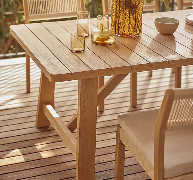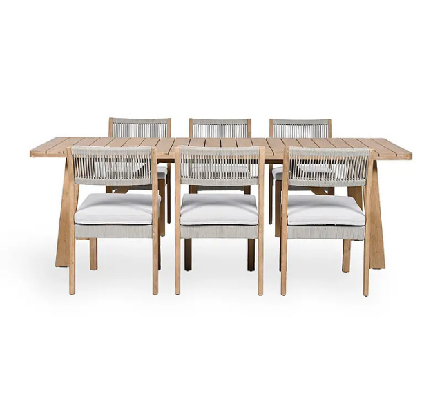 ชุดโต๊ะรับประทานอาหารกลางแจ้งไม้สักแท้สไตล์ทรอปิคอลทันสมัย 6 ที่นั่ง รูปทรงสี่เหลี่ยมผืนผ้า เฟอร์นิเจอร์สำหรับสวนและลานบ้าน กันน้ำ เป็นมิตรกับสิ่งแวดล้อม