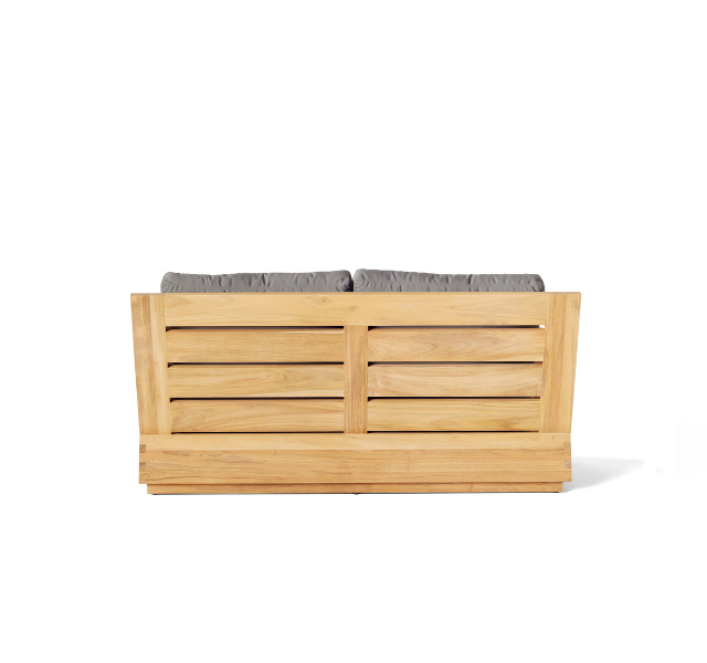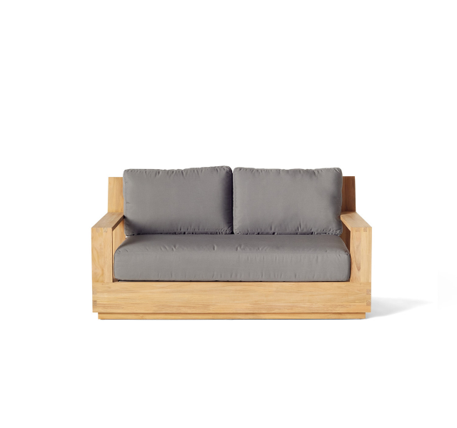 โซฟาไม้สักแท้สำหรับกลางแจ้ง ดีไซน์โครงกล่องแบบทันสมัย สำหรับสองที่นั่ง พร้อมเบาะหนานุ่มสีเทา กันน้ำ เหมาะสำหรับห้องนั่งเล่น ระเบียง และเฉลียง