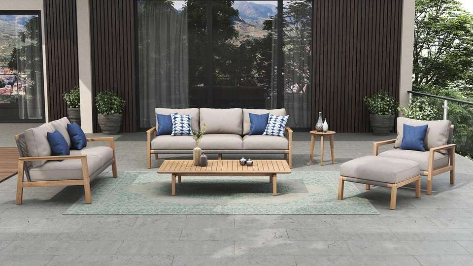 ชุดโซฟาไม้สักแท้ทันสมัยสำหรับกลางแจ้ง พร้อมเบาะกันน้ำ หรูหรา เหมาะสำหรับสวน ลานบ้าน ห้องนั่งเล่น รีสอร์ท และโรงแรม