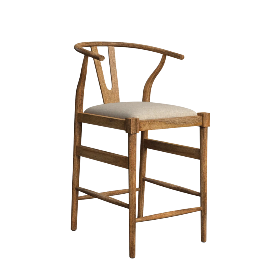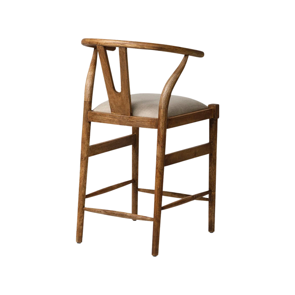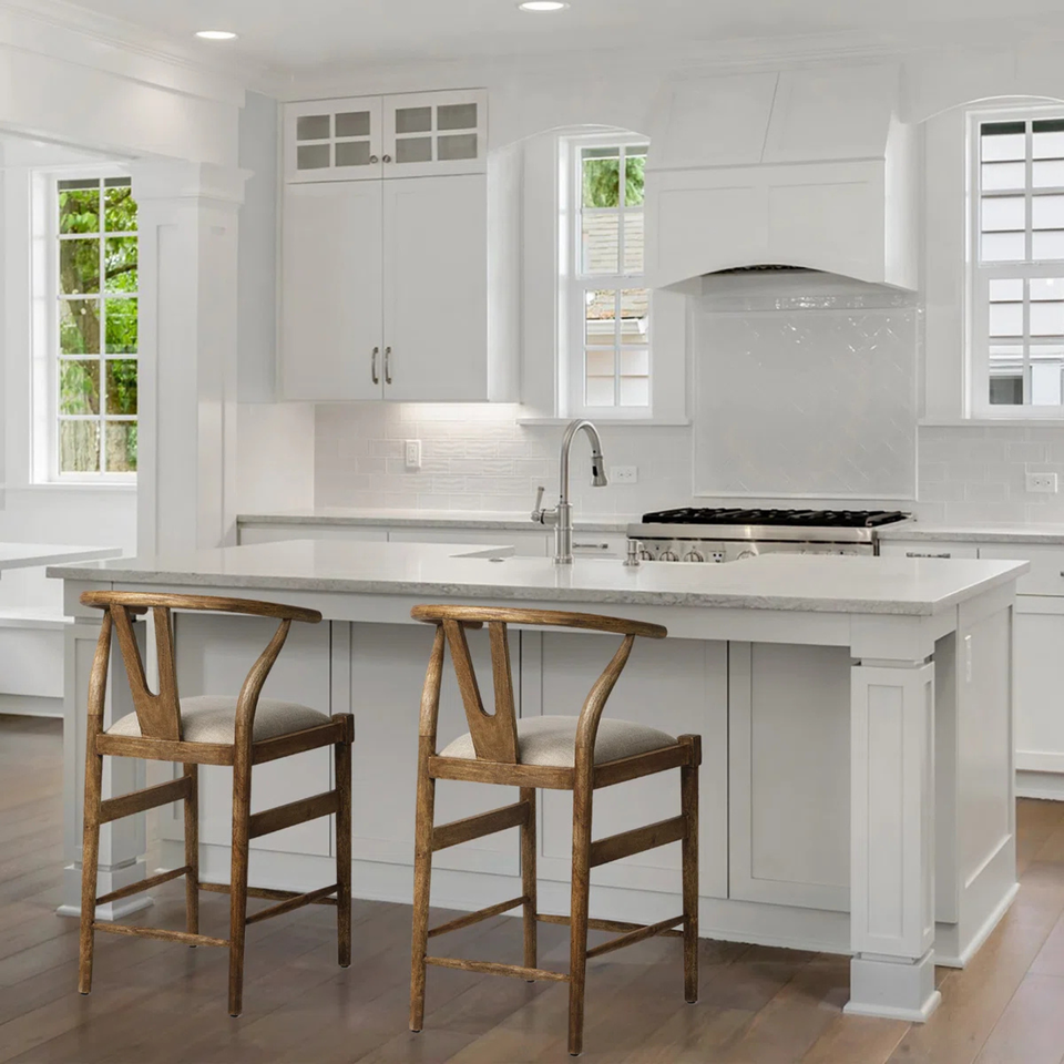 เก้าอี้บาร์ไม้เนื้อแข็งที่ทันสมัยพร้อมพนักพิงแบบโค้งที่นั่งหุ้มเบาะผ้าเก้าอี้สูงสำหรับห้องครัวและบาร์ที่บ้าน