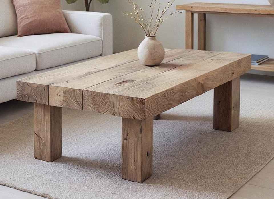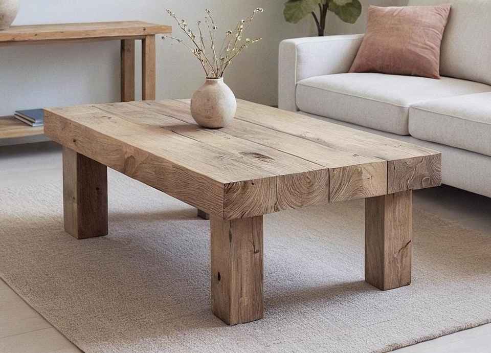 โต๊ะกาแฟไม้เนื้อแข็งทันสมัย พร้อมท็อปไม้ธรรมชาติหนา ขาเหลี่ยมแข็งแรง และพื้นผิวเรียบหรูสำหรับห้องนั่งเล่น