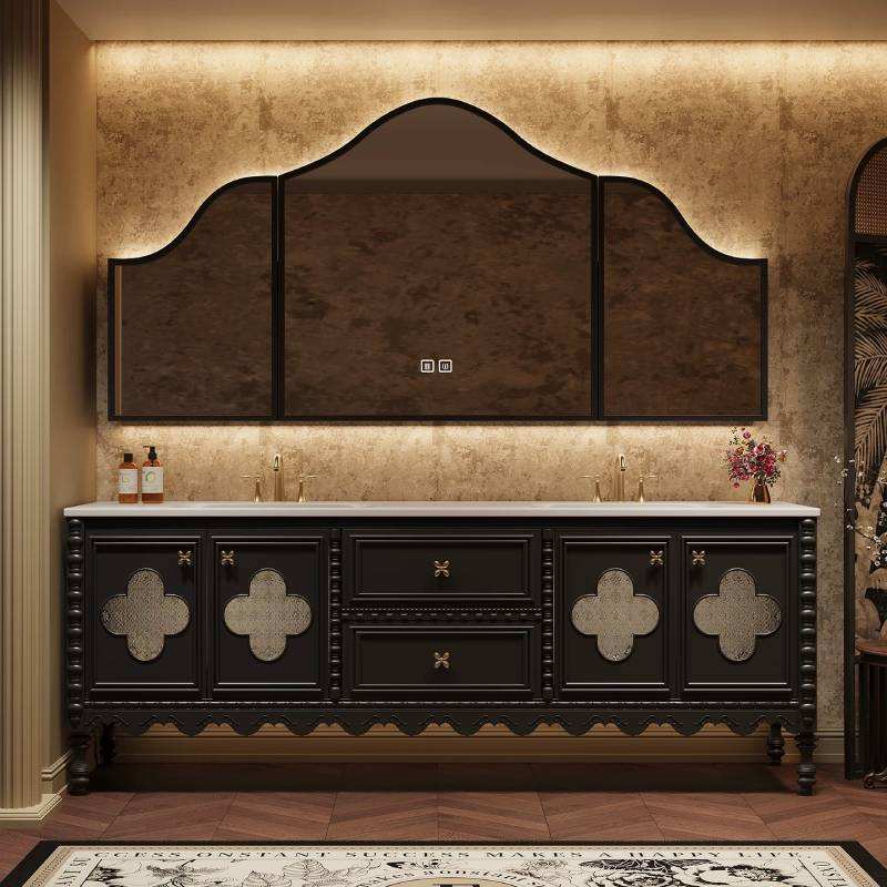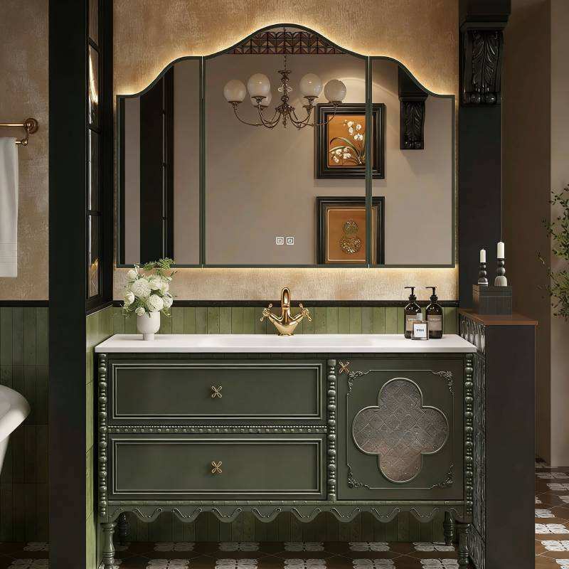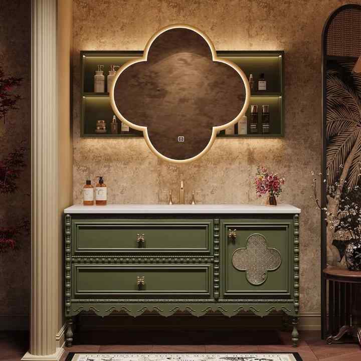 ตู้ห้องน้ำแบบรวมพร้อมกระจกกันฝ้า ปรับแสงได้สามสี กันน้ำ ผลิตจากไม้จริงเคลือบแลคเกอร์และ MDF รุ่นทันสมัย