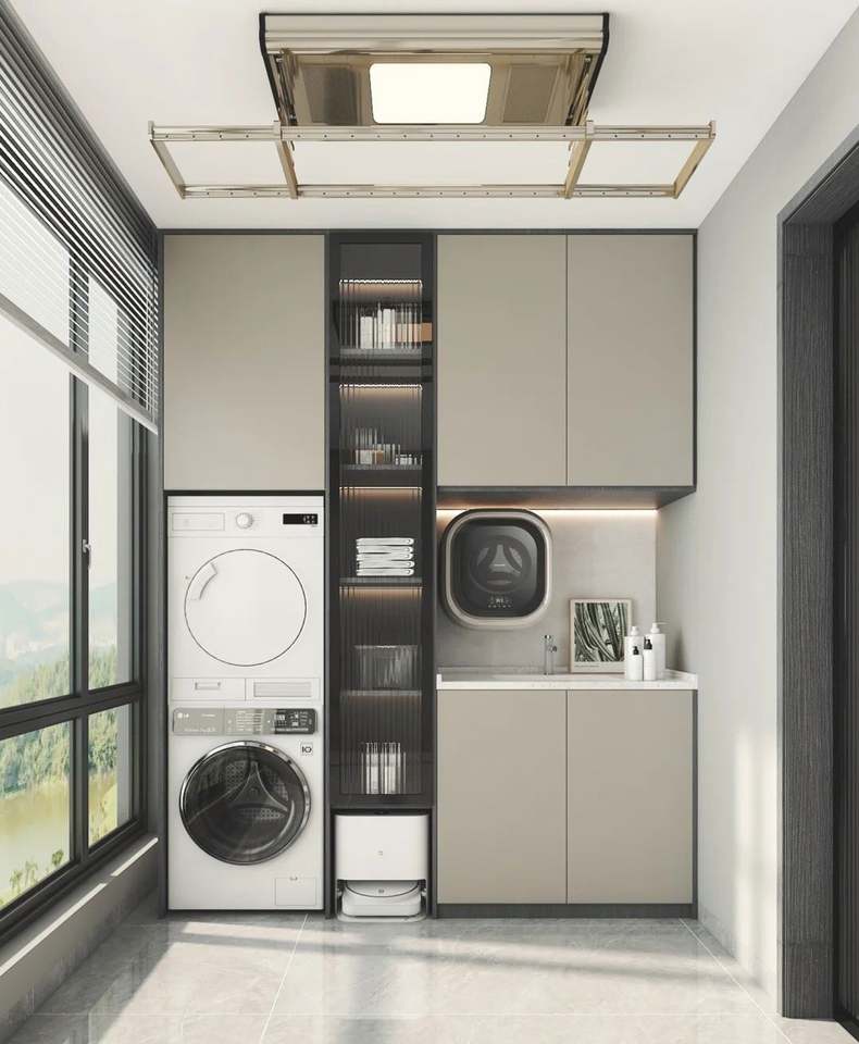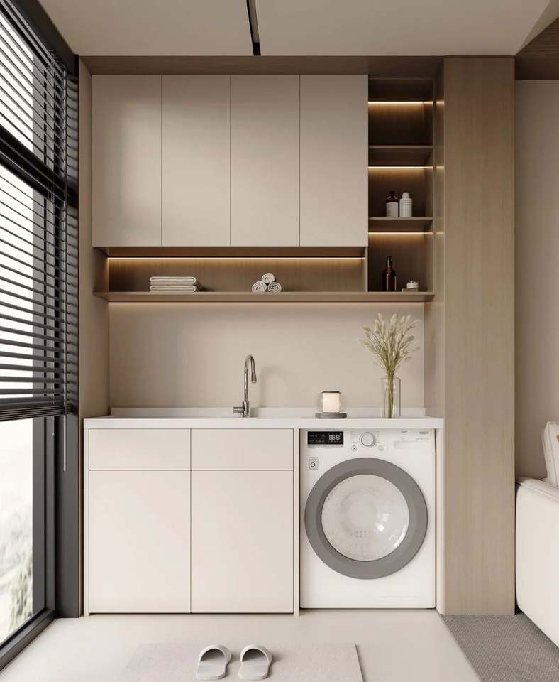 ชุดตู้ซิงค์ห้องซักรีดไม้จริงทันสมัยสำหรับเครื่องซักผ้า ดีไซน์สวยงาม