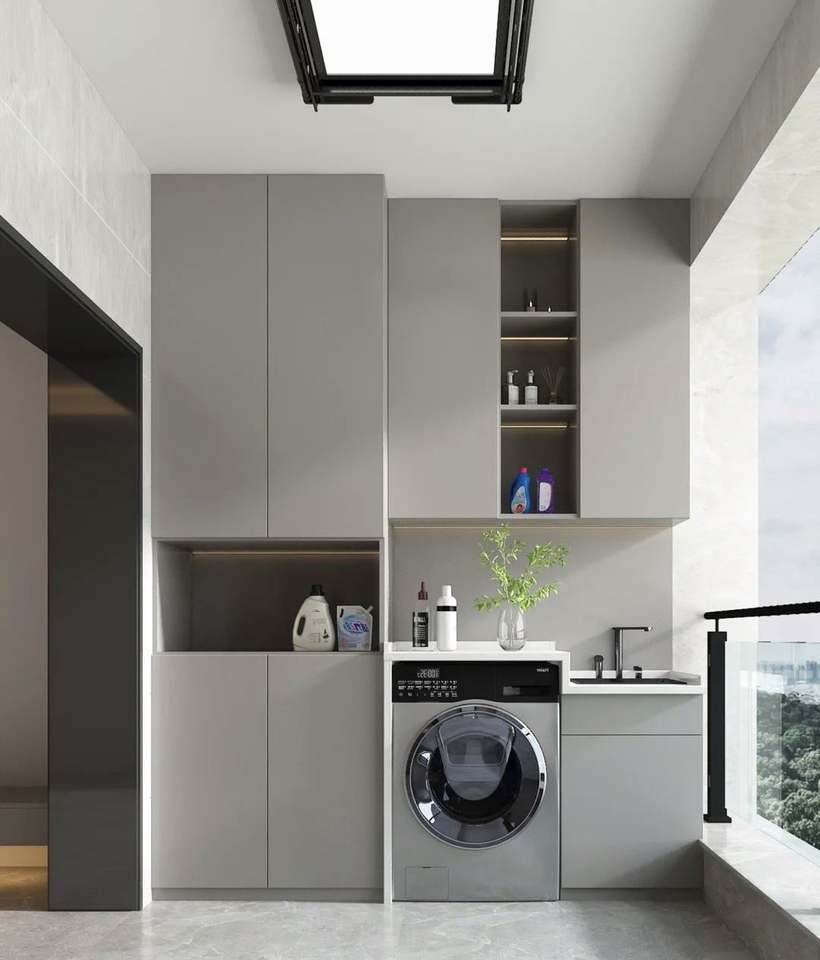 ชุดตู้ซิงค์ห้องซักรีดไม้จริงทันสมัยสำหรับเครื่องซักผ้า ดีไซน์สวยงาม