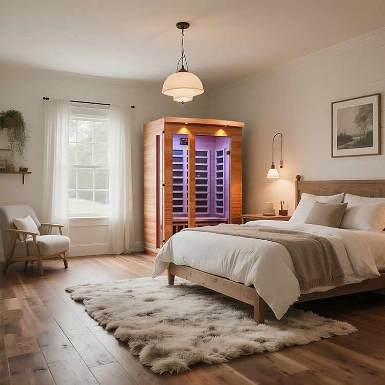 ห้องซาวน่าอินฟราเรดทรงสี่เหลี่ยมผืนผ้าไม้เนื้อแข็งทันสมัย พร้อมการบำบัดด้วยแสง สำหรับใช้ในห้องนั่งเล่นในอพาร์ตเมนต์หรือที่บ้าน แบบเต็มสเปกตรัม เป็นมิตรต่อสิ่งแวดล้อม