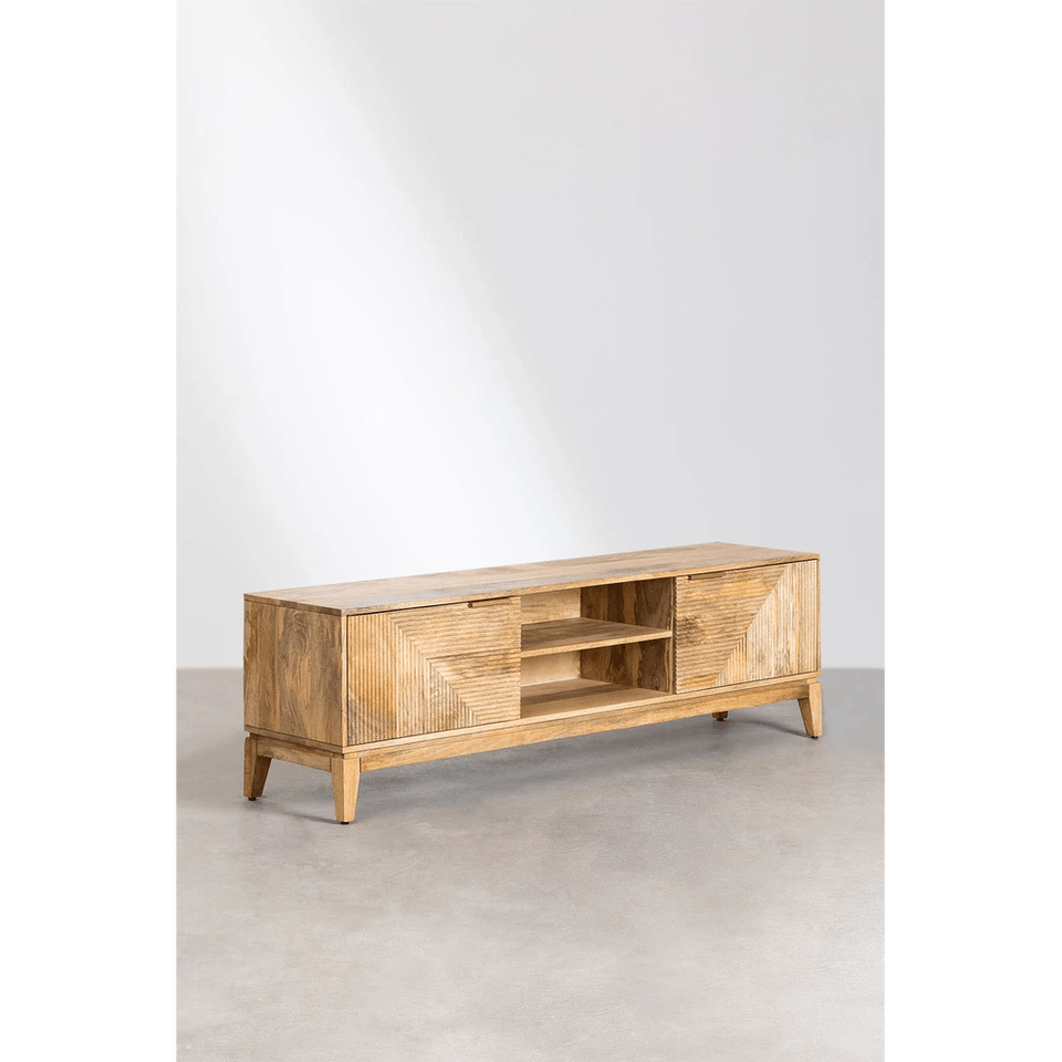 ที่วางทีวีทำจากไม้ในห้องนั่งเล่น