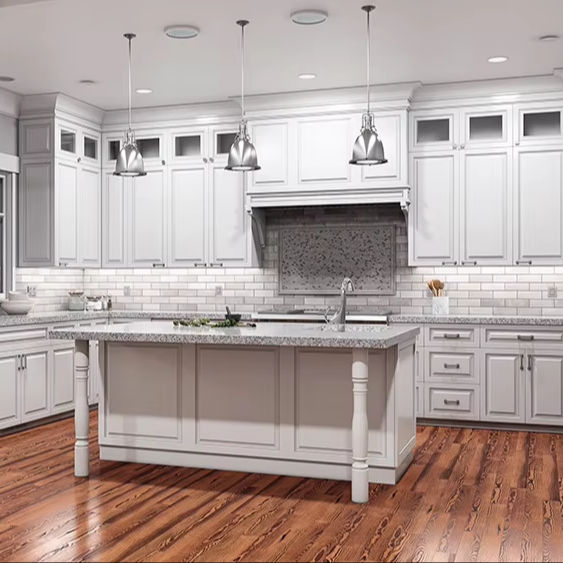 ตู้ครัว RTA ไม้เนื้อแข็งสีขาวทันสมัยผลิตจากโรงงานผลิตแล็กเกอร์แผงประตูพื้นผิวห้องครัว